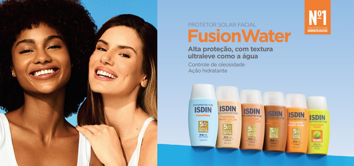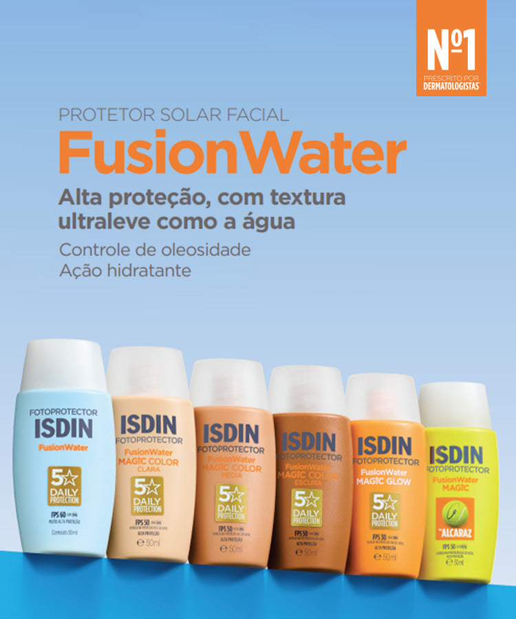 Sol lá fora, confiança na pele: ISDIN Fusion Water, o protetor solar mais prescrito do Brasil, agora com textura ultraleve, toque seco e proteção diária que você sente — e sua pele agradece.
